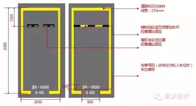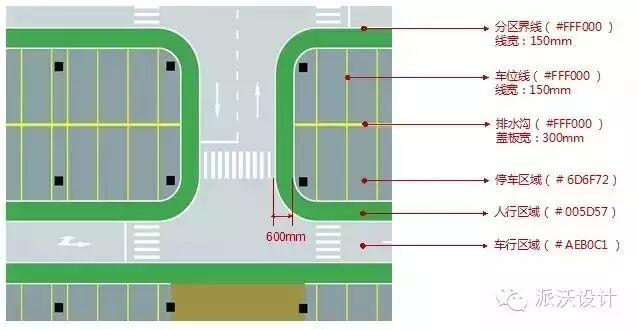 车库地坪需做路面交通分区设计,明确区别停车区域、车行区域、人行区域以及其他区域,人行区域宽度需≥600mm,分区界线线宽控制为150mm。
