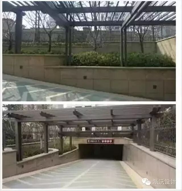 在出入口处结合地面景观顺应坡道路面做景观造型,打开车库出口视野。车库出入口后部做景观背景墙以弱化其对园区景观的影响。