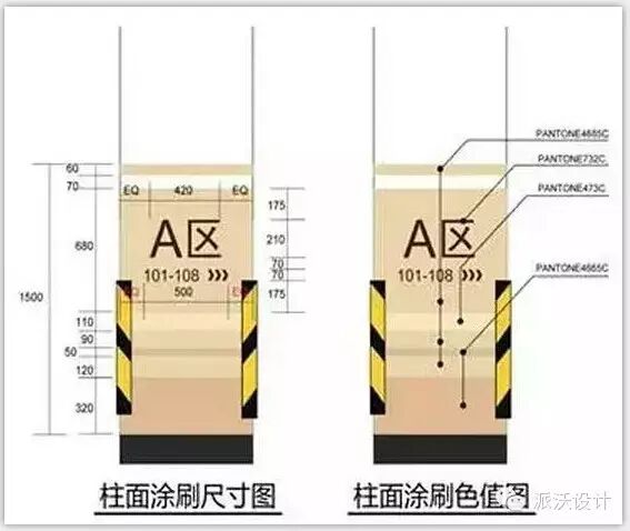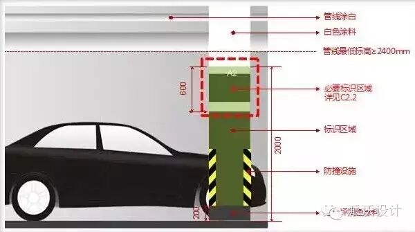 柱身踢脚部分至2000mm的空间范围内为地下空间分区标识区域,需根据该分区分色要求进行标识。其中,1400mm~2000mm为必要标识区。6柱设定之柱面美化处理