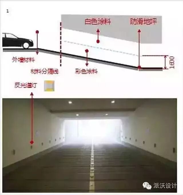 地下前厅入口采用暖色光源,照度均大于主车行道,有较好的导向识别作用。 地下前厅处墙面、地面、顶面、以及细节部分均采用室内相同材质颜色。2坡道示意图