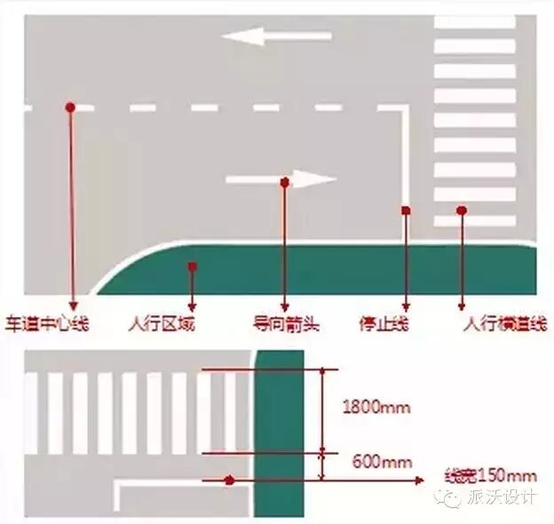 车行区域须绘制地面交通标识、标线。道路岔口、重要人行出入口前必须设置人行横道线。